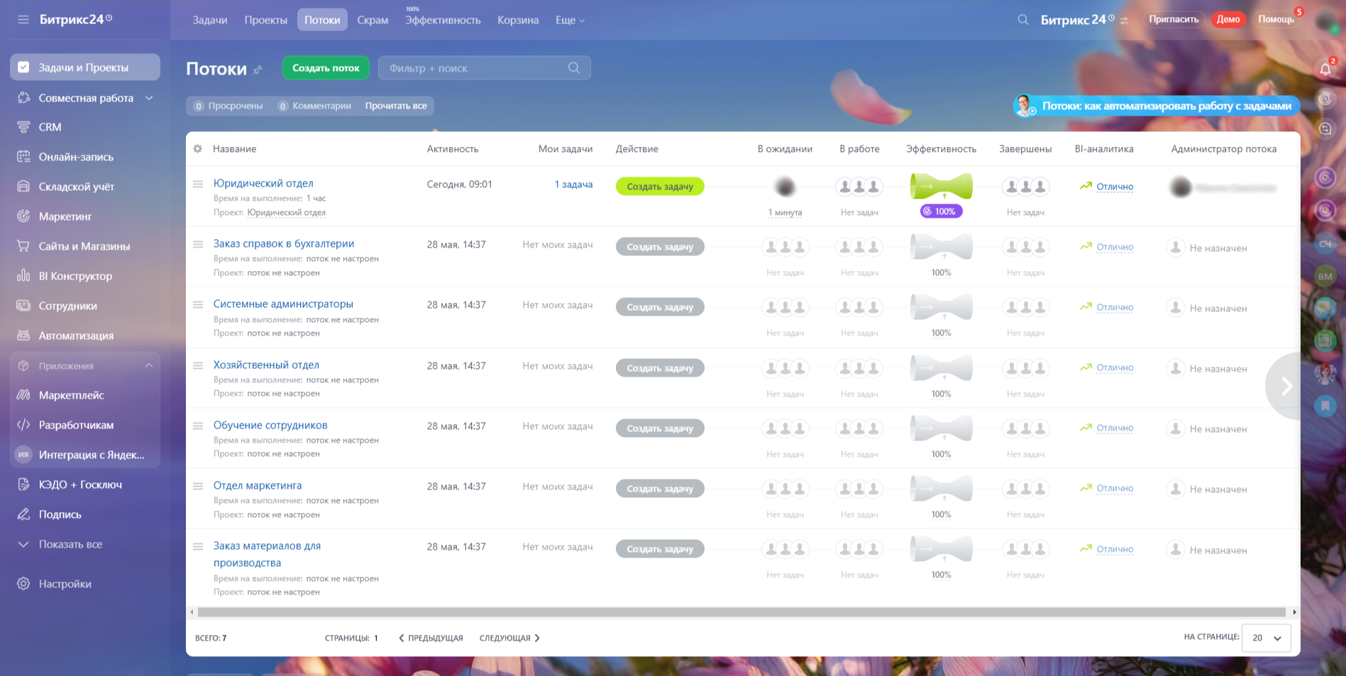 Потоки — это удобный способ организовать очередь задач внутри компании. По сути, Потоки — это просто очередь, в которую собираются задачи от разных сотрудников или отделов. Например, в юридическом отделе есть много однотипных задач — проверить договор, дать консультацию. Вместо того чтобы искать свободного юриста, достаточно поставить задачу в поток юридического отдела.