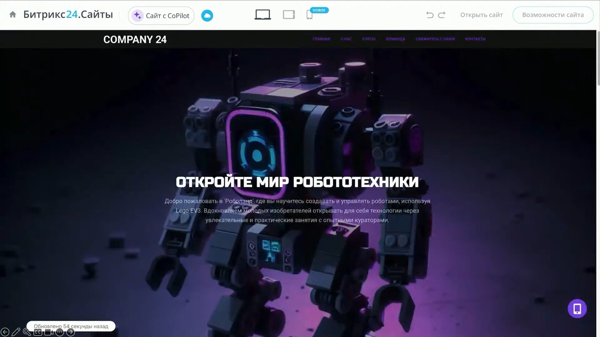 CoPilot в Конструкторе сайтов помогает легко создавать и редактировать сайты без технических навыков. Например, достаточно сказать: «Мне нужен сайт для студии робототехники», и CoPilot сделает такой сайт.