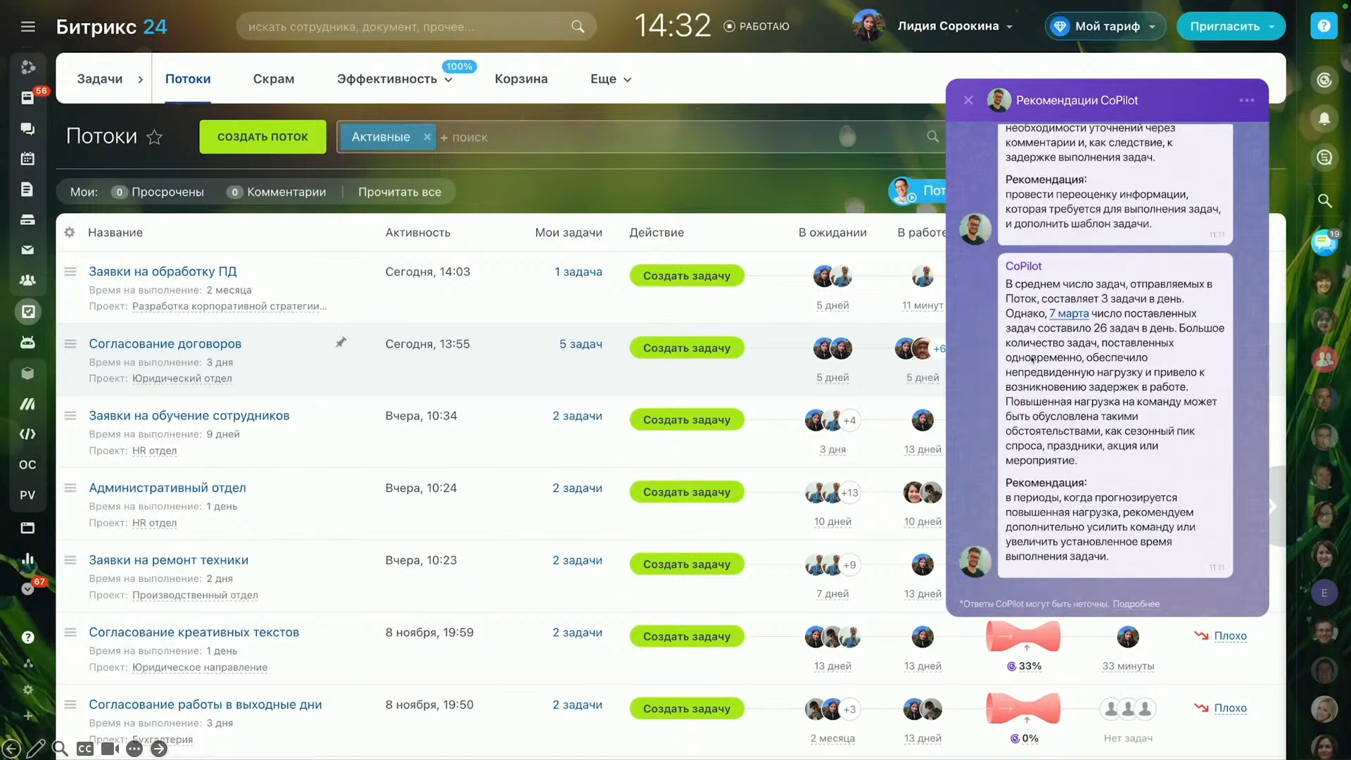 CoPilot анализирует эффективность потока и дает рекомендации. Например, если поток начинает работать с низкой эффективностью, CoPilot может предложить распределить задачи более равномерно среди сотрудников. Если проблема в недостаточном количестве людей в потоке, например, в момент сезонного пика или если задачи слишком сложные для текущего состава команды, CoPilot подскажет, что можно увеличить количество сотрудников или перераспределить нагрузку. Также может быть рекомендовано снизить количество потоков для отдела, если это перегружает сотрудников.