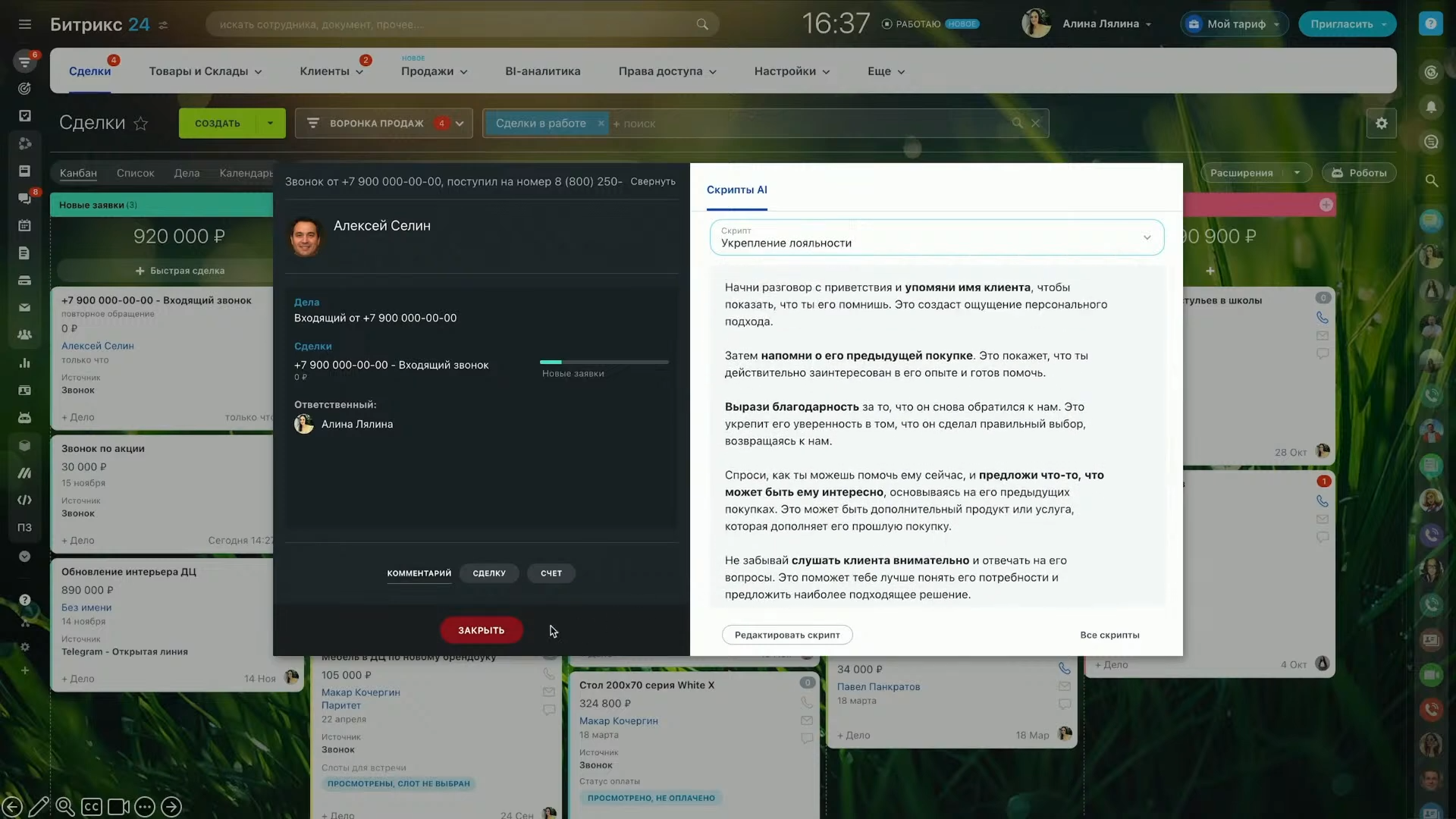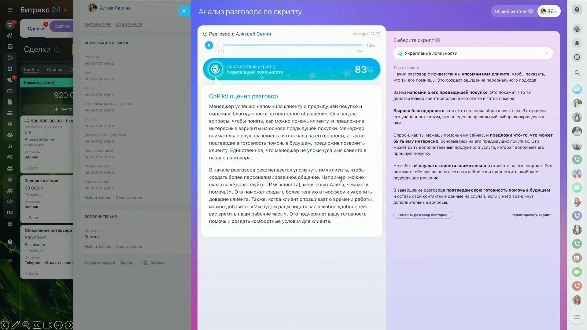 И CoPilot умеет оценивать эти звонки. ИИ анализирует разговоры и проверяет, насколько они соответствуют установленному скрипту. На основе этого анализа Копилот генерирует рекомендации по улучшению качества общения с клиентами. Это даёт возможность руководителям отслеживать, насколько эффективно сотрудники соблюдают скрипты, и где им можно улучшить свои навыки.