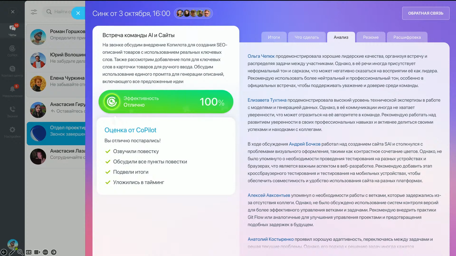 CoPilot оценивает качество встреч с учетом нескольких факторов. Например, была ли озвучена повестка, обсуждались ли все пункты, соблюдался ли тайминг и подводились ли итоги. Это помогает не только повысить продуктивность встреч, но и развивать навыки сотрудников. CoPilot может похвалить одного из участников за чёткие предложения, но отметить, что в будущем ему стоит быть мягче в тоне, если он был слишком категоричен.