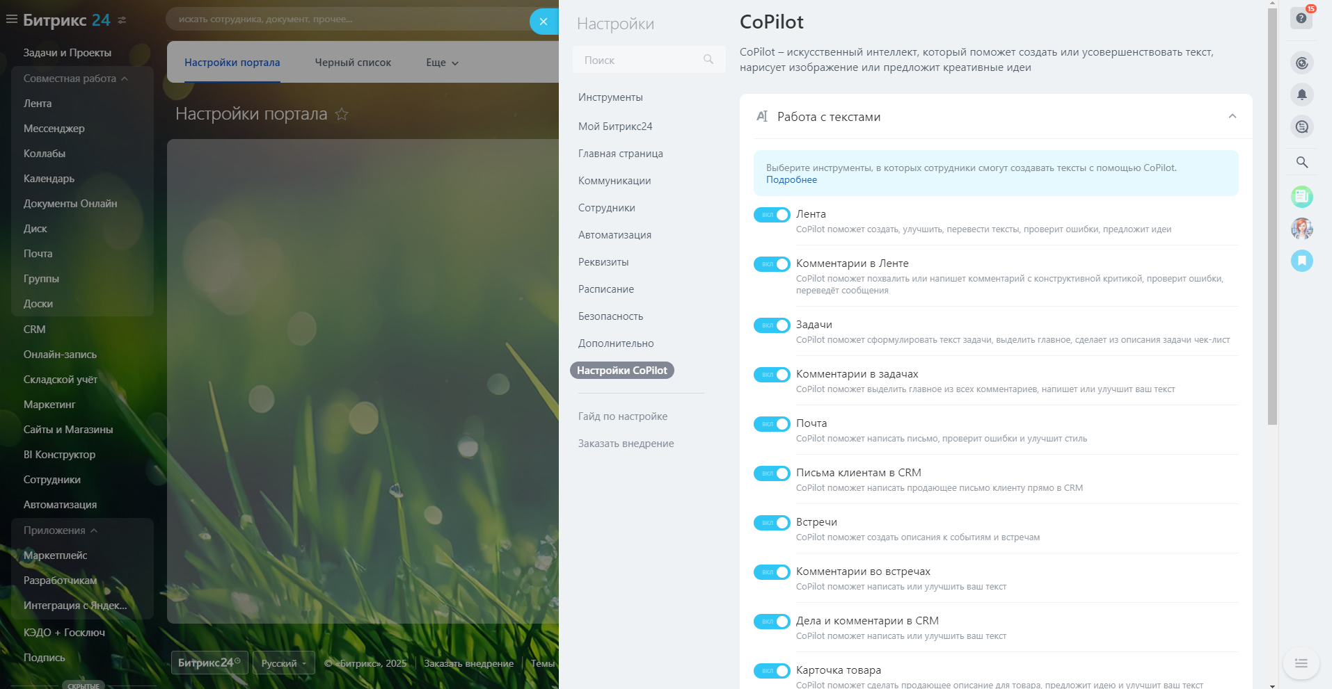 Включить и отключить CoPilot можно в настройках Битрикс24. Перейдите в раздел «Настройки» и откройте подраздел «Настройки CoPilot». Здесь вы сможете настроить, где именно будет доступен CoPilot и какие его функции можно будет использовать.