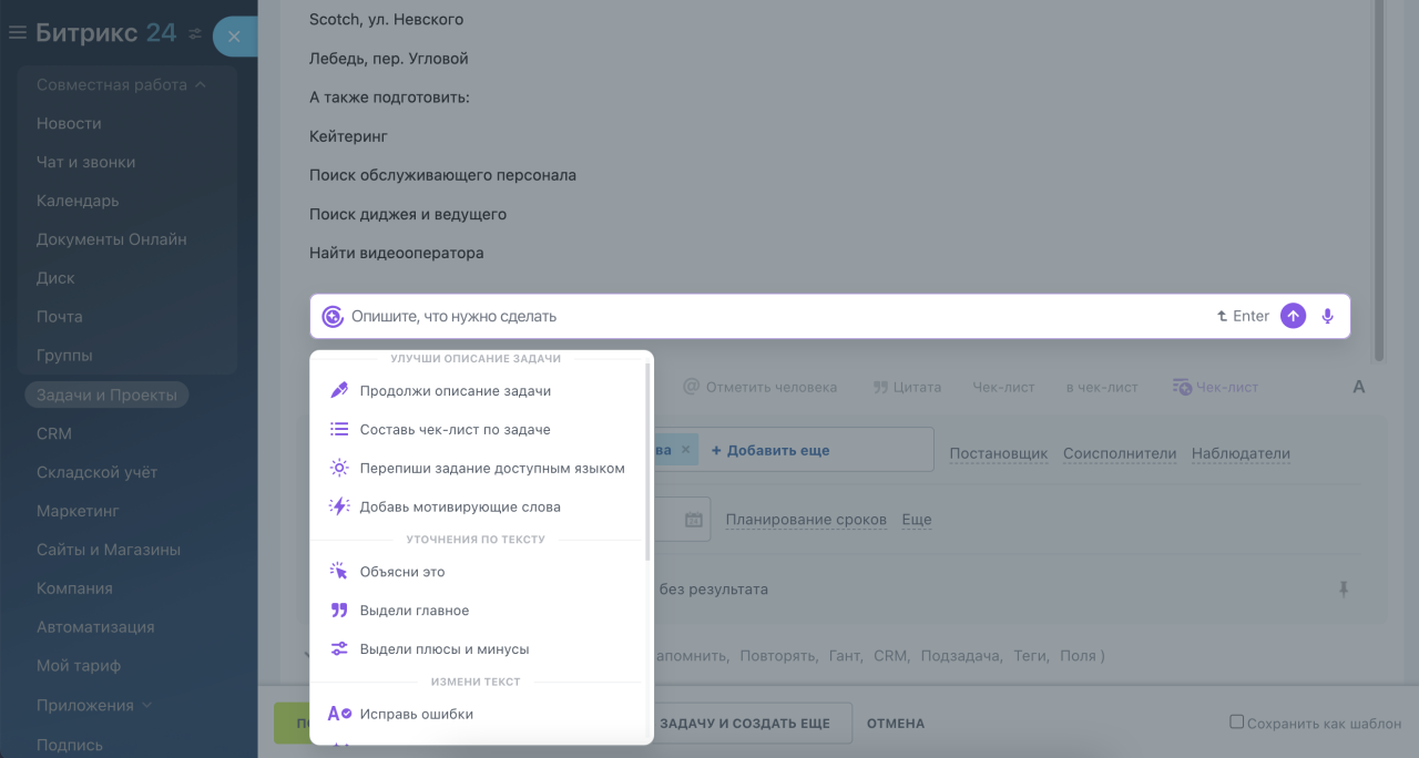 С помощью ИИ можно упростить создание и редактирование задач, составление чек-листов, а также работу с комментариями.