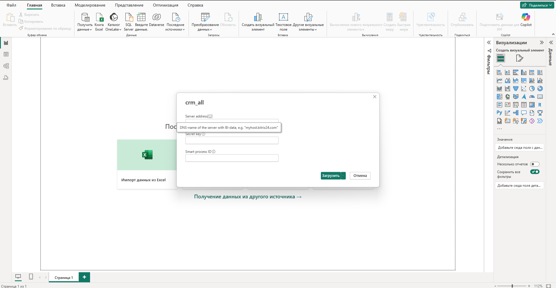 Теперь откройте этот файл в Power BI. В появившихся полях введите адрес сервера и секретный ключ из Битрикс24. Нажмите «Загрузить», Power BI подключится к Битрикс 24 и импортирует данные. После этого вы сможете строить свои отчёты и визуализации, анализировать любую нужную информацию.