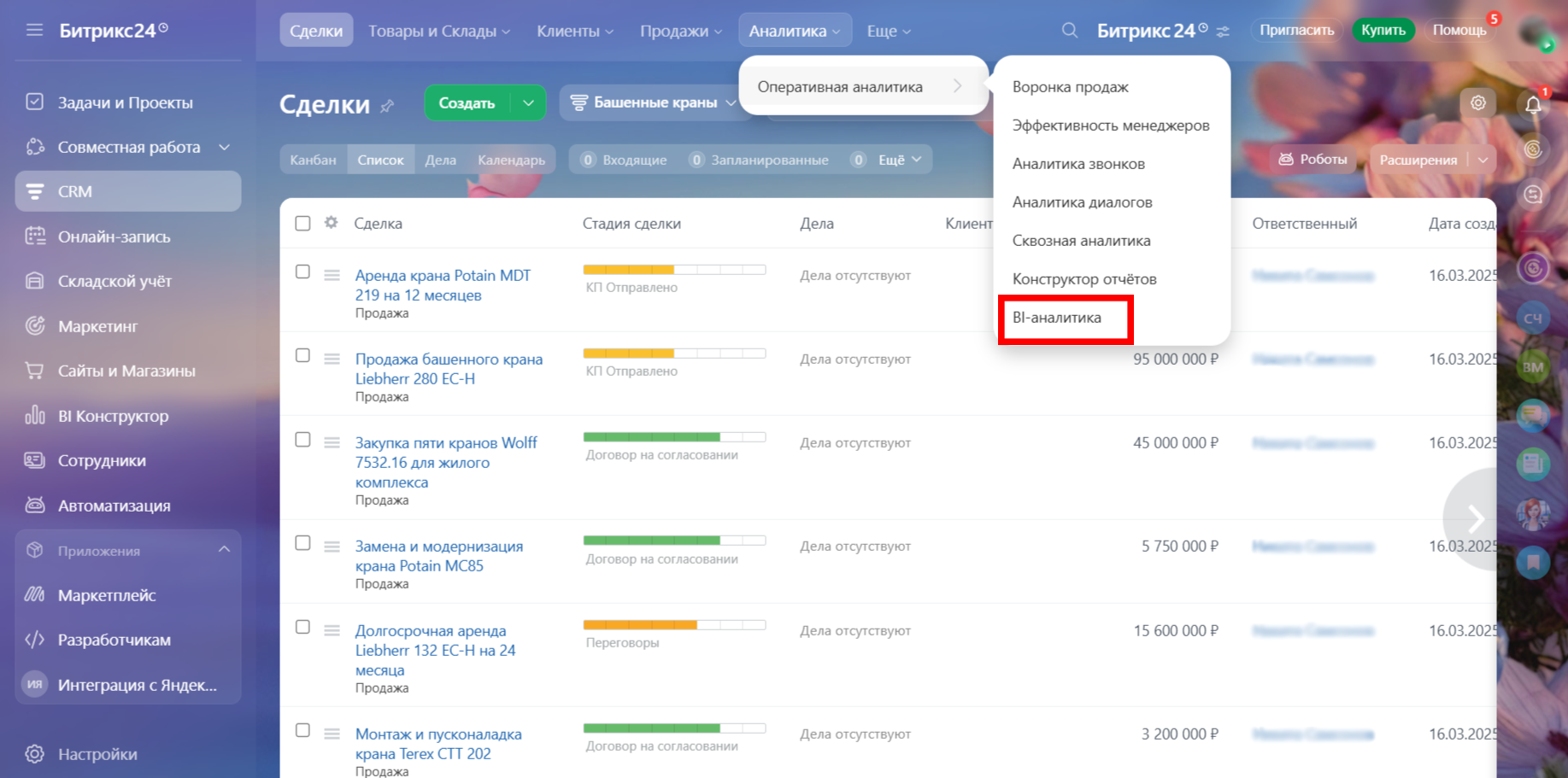 Для начала откройте в вашем Битрикс24 раздел с BI-аналитикой. Для этого перейди в CRM, в верхнем меню наведи на «Аналитику», затем на «Оперативная аналитика» и в появившемся меню кликните на «BI-аналитику».
