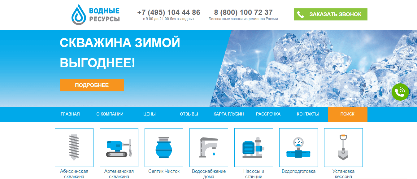 Компания «Водные ресурсы» существует с 2005 года и на сегодняшний день является одним из лидеров в сфере бурения скважин на воду!